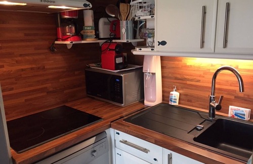 The kitchenette is equipped with a stovetop, a refrigerator, and a dishwasher, as well as a coffee maker, an electric kettle, and a microwave. Bathroom amenities include a hair dryer, towels, and toilet paper. And there is a laundromat nearby so you can pack a bit lighter. Other amenities include a sofa bed, bed sheets, an ironing board, and bike storage.