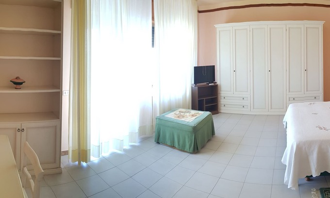Accommodation on the second floor, appreciated for its brightness, spaciousness, elegance, efficiency and functionality. Superior quality furnishings and fittings. Large Window/Balcony with curtain and mosquito net (security lock) - Air conditioning (automatic) - Fast Wi-Fi - Smart TV 32" - Door with key lock - Drinking water point. Day/Night Rooms: complete kitchenette, with peninsula, stools, refrigerator/icebox, washing machine, electric oven, microwave, table/chairs, iron and ironing board, tools and accessories for the house and for cleaning, covered terrace, furnished and equipped, wires for hanging laundry. Double bed, with high reinforced mattress and anti-mite mattress cover, fresh cotton linen, large closet, mirror, space for cot/additional beds, use of armored closet (on request). Private bathroom: windowed, full equipment, shower, large bathtub, illuminated mirror, hair dryer and personal hygiene products.