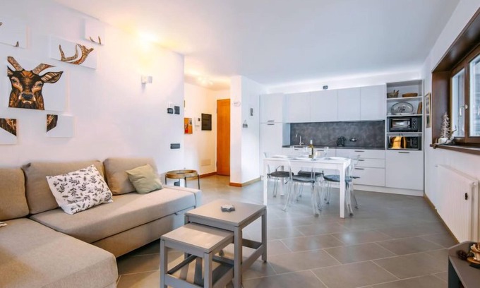 "Appartamento 29", 3-room apartment on 2nd floor, south facing position. Fully renovated in 2022, very comfortable and beautiful furnishings: living/dining room with 1 double sofabed, kitchen corner, shower/bidet/WC and TV. 1 double bedroom with bath/WC, bidet, hydro massage shower and TV. 1 room with 1 bed and 1 x 2 bunk beds, 1 pull-out bed. Kitchenette (mini-oven, oven, dishwasher, 4 induction hot plates, toaster, kettle, microwave, electric coffee machine). Balcony. Balcony furniture. View of the mountains and the valley. Facilities: washing machine, hair dryer. Internet (WiFi, free). Parking space n 29 (roofed), height 245 cm. Please note: suitable for families. Non-smokers only. Fire extinguisher. IT022039C2NKB2J3H6