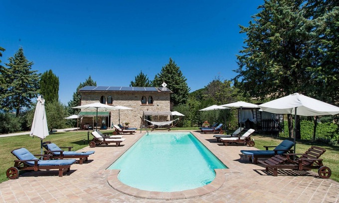 Your own traditionally restored villa of stone and wood complete with pool house and views on the order of a dream! In a beautiful green and mountainous landscape adorned by sunflowers and olive trees, this family has created six wonderful accommodations on their stunning property. The 18th century farmhouse situated atop a hill is surrounded by flowered fields and woods. The 15 hectare site is completely enclosed and has a large remote controlled gate (you will receive a remote upon arrival). Due to the altitude of the property, each villa has a wonderful view. Guests of Caldaruccio can enjoy the luxury of the estate and the silence of the surroundings - all the necessary ingredients for an unforgettable holiday. You can swim or relax in the sun or in the big hammock in the garden, barbecue or go hiking, biking or ... do nothing! For dinner or an aperitif you can visit restaurants in nearby villages like Ramazzano (only 700 meters from the estate). This village also has a supermarket and a bakery. From the estate you can choose from a number of paths that lead you through the unique countryside and hills as well as through the woods of Umbria. Feel free to ask the owners for tips on scenic routes in the area, they will be happy to advise you!