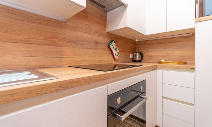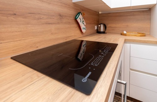 The fully equipped kitchen is the highlight of the apartment, with an induction hob, refrigerator, oven, microwave, coffee machine, kettle, and all the necessary utensils to prepare delicious meals.
