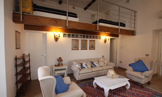 The apartment, brand new and completely renovated, is equipped with all the comforts (A/C, TV, WIFI, oven, dishwasher, washing machine, autoclave and autonomous water tank) and is furnished with sober taste. The apartment consists of two large rooms with very high ceilings furnished with the philosophy of the loft: a large area used as a kitchen and dining room, a spacious living room, a bathroom and two sleeping areas on the mezzanine that allow you to share time spent indoors without creating enclosed spaces. The apartment has a total of five beds (one double bed and three single beds).