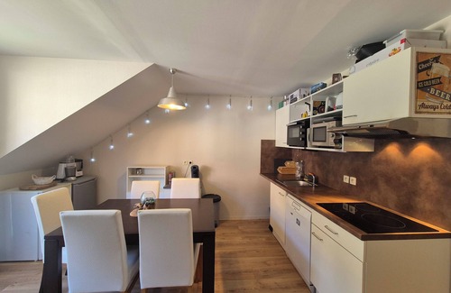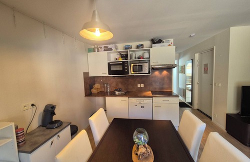 - **Pièce de vie** : spacieux séjour avec une cuisine entièrement équipée (four micro-ondes, plaque de cuisson, lave-vaisselle, réfrigérateur, congélateur)