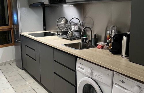 - Cuisine avec un espace bar et ses chaises hautes et entièrement équipée : micro-ondes, réfrigérateur avec distributeur d’eau fraiche, grand lave vaisselle de 6/8 personne, machine à laver, sèche linge indépendant, plaque à inductions, hotte, bouilloire, cafetière Nespresso et de nombreux accessoires de cuissons