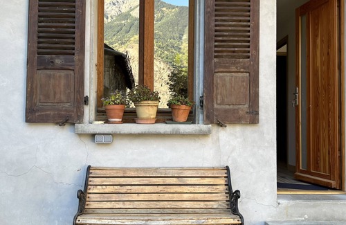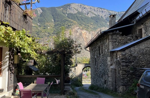 L’appartement, offrant une vue sur la montagne, est situé en rez-de-chaussée avec une cour commune, au cœur du village du Bourg d’Oisans.
