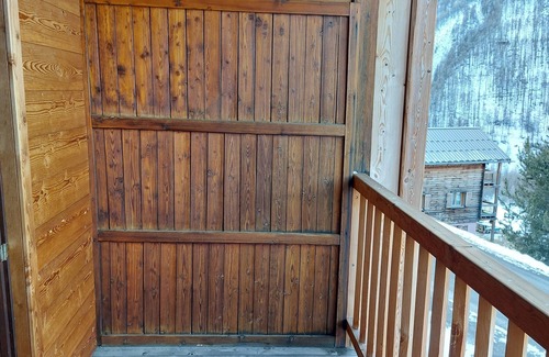 Balcon exposé sud avec vue sur la vallée et le torrent, possibilité de manger sur le balcon, table pliante et chaises d'extérieur