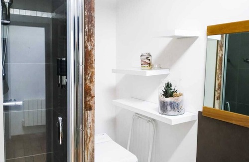 SALLE DE BAIN : Une salle d'eau avec douche, meuble vasque, machine à laver, sèche serviette et sèche-cheveux.