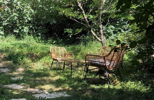 - Like a cabin, between forest and river, with a terrace facing the garden.