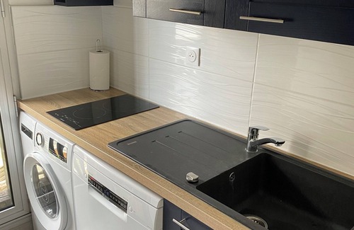 The kitchen is equipped (dishwasher, washing machine, Senseo coffee machine, microwave, oven, 2 induction hobs, large fridge/freezer, ...) with everything you need for a comfortable stay. A welcome kit is offered to allow you to start your stay in complete serenity (SENSEO coffee pods, dishwasher tablets, sponge, toilet paper, garbage bag, tea towel, etc.) and a kitchen base (salt, pepper, sugar, etc.).