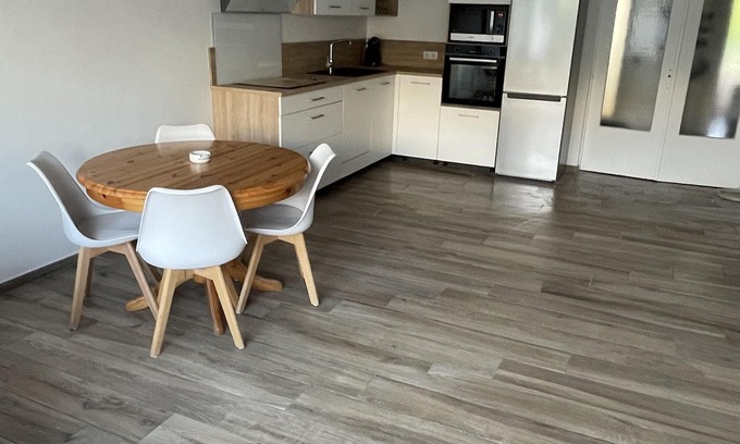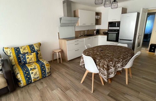 Se composant d'une pièce principale munie d'un canapé lit (160X200) avec cuisine entièrement équipée (hotte, four, micro ondes, plaque induction, cafetière dolce gusto, plancha électrique …) et d’un salon avec un grand écran plat de 127cm. Il est possible de rajouter une rallonge sur la table de la salle à manger en pin.