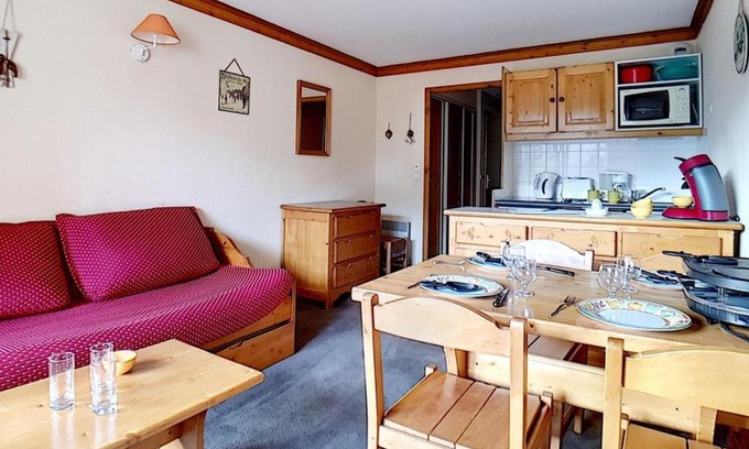 Appartement skis aux pieds avec balcon exposé sud, 2 pièces, 4 pers., quartier animé des Bruyères - FR-1-344-904 is located in Les Bruyères, just 27 miles from Méribel Golf Course and 30 miles from Galibier-Thabor. Guests staying at this apartment have access to a terrace. The apartment is composed of 1 separate bedroom, a fully equipped kitchen with a dishwasher and a microwave, and 1 bathroom. A TV is offered. For added privacy, the accommodation features a private entrance. Skiing is possible within the area and the apartment offers ski storage space. Chambéry-Savoie Airport is 71 miles from the property.