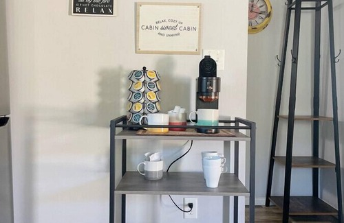 This second floor guest apartment is perfect for a couple. Sit on the balcony and enjoy being nestled among the pines. Comfortable queen bedroom, full kitchen (minus a stove/oven) and modern 3/4 bathroom.