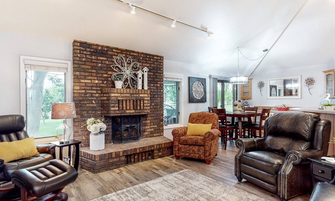 - Spacious Living Areas: Enjoy an open-concept layout featuring a large living room equipped with ample seating and a cozy wood-burning fireplace, perfect for gathering after wedding festivities.