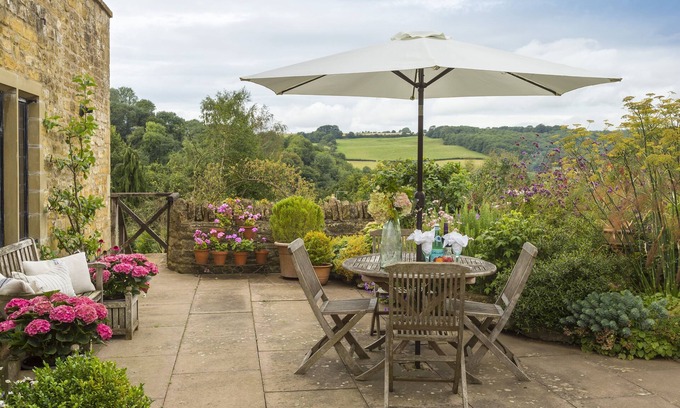 Outside is a terrace area with a table and seating for four where you can enjoy the idyllic views across the Cotswold countryside. Charcoal barbecue provided.