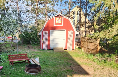 The private apartment entrance is in the backyard. There is a slight hill to walk down from the driveway parking. Enjoy a fire in the private fire pit area outside the apartment entrance.