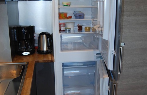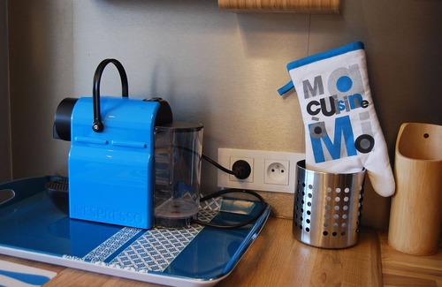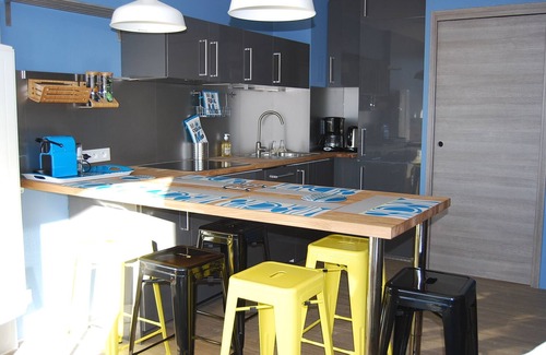 It has a living room with a fully equipped kitchen (fridge, induction hob, convection oven, microwave oven, hob, dishwasher, Nespresso + filter coffee maker, toaster, kettle, raclette) and a sitting area with a sofa bed tilting of 160 x 200, plenty of storage, a LED FULL HD TV 105 cm and BLUE RAY DVD player.
