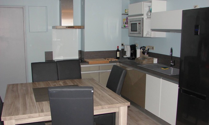 a living room with a seating consists of 1 sofa bed Type rapido and 1 sofa relaxing coffee table, 2 TV + DVD Player + possibility of separating the sleeping rapido 140 of the dining room / kitchen with Japanese curtain, the dining room / kitchen includes a table 135 * 135 with 6 chairs high comfort backrest, 1 oven + 1 microwave + 1 large fridge freezer + plate induction hob, extractor hood + dishwasher + sink + wall unit and down + coffee machine + toaster + kettle + device raclette etc .... in the large closet entrance, storage shelf with storage ski boots, safe, range in height suitcase, 2 keyrings apartment are provided.