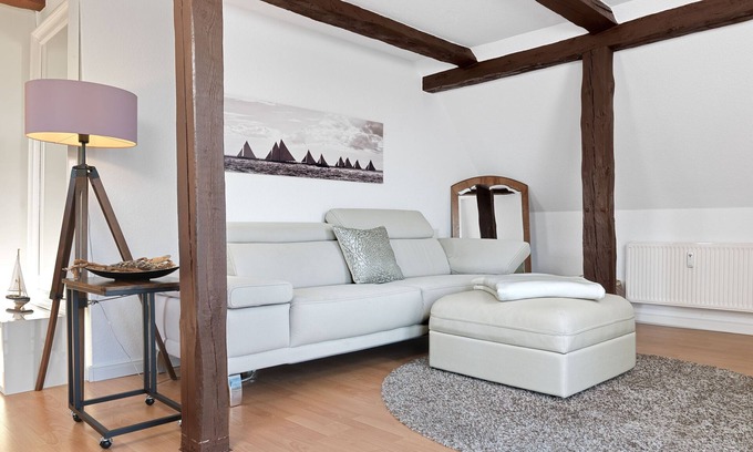 In the spacious attic you will find a second double bed (box spring bed 160x200m), a pull-out single bed (90x200m, extended 160x200m), a wardrobe and a desk. The accommodation can accommodate 4 adults + 2 children.