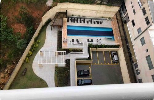 Os hóspedes podem desfrutar de comodidades como ar condicionado, filtro de agua gelada, tv smart, internet Wi-Fi, ferro de passar roupas, academia de ginástica, piscina, 2 vagas de garagem, e uma vista incrível da varanda mostrando o horizonte da Cidade, .