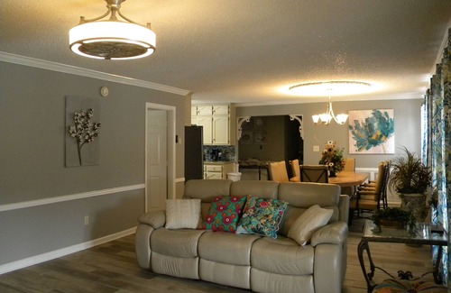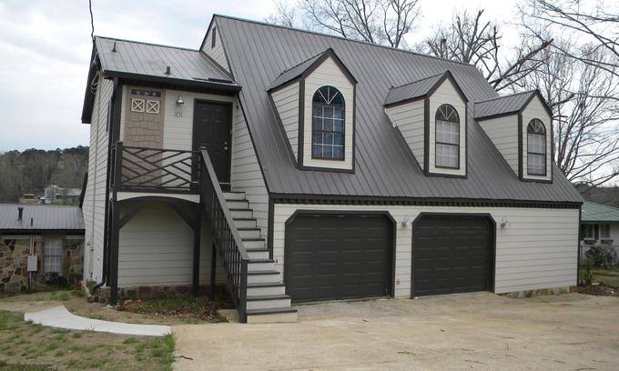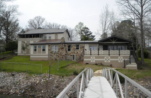 Parking has provisions for 2 car covered carport and a concrete drive for 2 cars. A vacant corner lot 200 feet from home will allow for boat trailer, jet-ski trailer and overflow guest parking is provided. The rates for labor day/memorial day 4th july are $500.00 additional for a 4 night booking. The house can be used as two separate houses and basically is two kitchens two laundry rooms with washers and dryers .There are two porches both covered and both with table and chairs for lake front views. All of the kitchens are equipped with new Pioneer Women pots and pans, new coffee maker's and can opener's, and silverware. The flooring is mostly tile whitewashed hardwood look a like with some hardwood look a like vinyl plank.