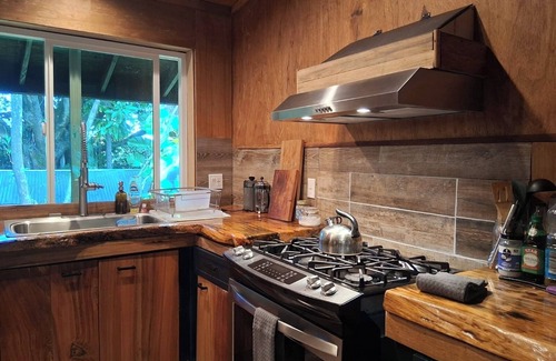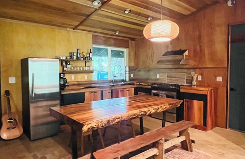 The home (Aquatemple) has a well stock kitchen for cooking, and a large lanai to relax and gather. The cabin is overlooking the river beach, and is a favorite amongst guests. The home has one queen bed and two twins, the cabin has a full bed. The home has a full bathroom with outdoor shower. There another covered outdoor full bathroom right near the cabin as well. The entire property is off grid with water catchment and solar power. Water filtration devices are provided for drinking water.