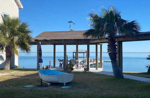 Bay Dock Cottage has a patio deck, a boat dock, a 100’ fishing pier with lights, a patio and lots of parking. Our two bedroom 2 1/2 bath house sits next to the 14’ deep Aransas Channel. Shrimp boats and fishing boats use this waterway to navigate local bays as they make their way to and from the Gulf of America through the jetties. This is a family friendly property. We are located 3 miles east of Conn-Brown Harbor and 3 miles west of the Port A Ferry.