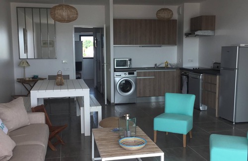 Composed of an entrance with cupboard, a bedroom with 2 single beds 90, wardrobe, bathroom with Italian shower, large living room of 30 m2 with equipped kitchen and living room sofa bed, extended by a large terrace 15 m2 with table and deckchairs