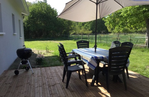 Two terraces with deckchairs, garden furniture, parasol, barbecue.