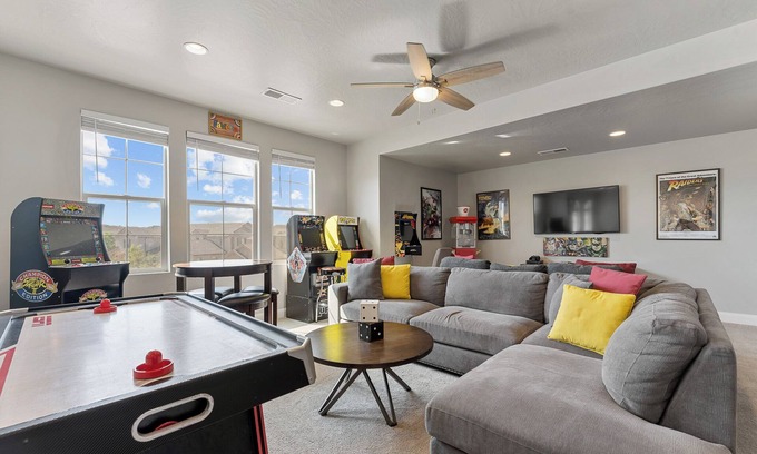 From the movie-themed family room and arcade room to the outdoor living space with a fire pit, this home has YOU written all over it! The main floor is spacious, light, and airy the minute you walk in. The living room has a large sectional sofa and a love seat that has a pull-out twin sofa. The kitchen has white cupboards, quartz countertops, and stainless steel appliances - including a gas stove. There are four bar stools at the counter for additional seating. The kitchen comes with everything you need to prepare and serve your meals. You can sit at the big dining room table with 8 chairs or go outside and enjoy more seating on the covered patio. The patio is secluded and a great place to enjoy in the day or evening time, be sure to turn on the gas fire pit for added fun and ambiance. A grill is provided for additional cooking options. The master bedroom with a king bed and on-suite compliments this level perfectly and has a flat-screen TV. There is an additional bedroom with a queen bed and a bathroom at the front of the house.