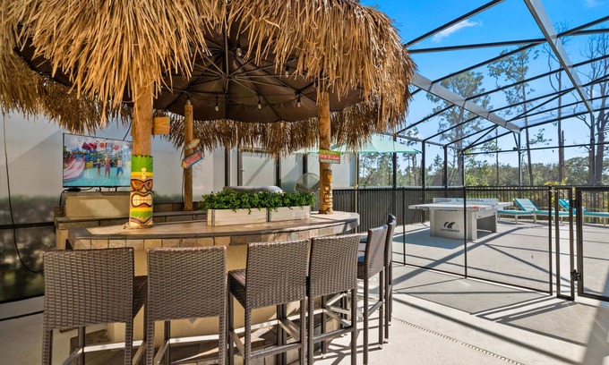 As soon as you enter this home, you'll be welcomed by the expansive living area, furnished with contemporary decor, including a large sectional sofa and an 86-inch flat-screen TV - perfect for enjoying movie nights or just relaxing together. The expansive kitchen is fully equipped with high-end appliances, dual refrigerators and dishwashers, making it ideal for preparing group meals. The dining area features an oversized table with lots of seating. The ground floor gets plenty of natural light, thanks to the large sliding glass panel door which is also access to your very own private resort-style pool. An outdoor ping pong table, authentic Tiki bar, and stylish outdoor furniture can also be found on the supersized pool area for all of your entertainment and relaxation needs. Did we mention the expansive meadow views. No rear neighbors!