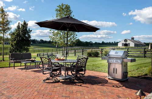Upon arrival, you’ll enter from beautiful tree-lined Mount Horeb Pike through Arcadia Farm’s front gate (secured with a code) and follow the paved drive up a gentle incline to the cottage. There is a parking area at the top of the hill adjacent to the patio and side entry door. The property is full of thoughtful touches intended to honor the history of the farm and surrounding area, such as the stone steps that were brought in from an old bridge nearby and the bricks that make up the patio, which were reclaimed from block barns on the property. The patio has panoramic views and is the perfect place to enjoy the gentle Bluegrass breeze over a meal outside or gaze at the vivid stars at night. Inside, the luxury interior design has left no stone unturned. Equestrian style furnishings are perfectly suited to the surroundings and the kitchen features Bosch appliances and a beautiful custom table, made from wood from an old tobacco barn. All three bedrooms have flat screen televisions with Dish network, Tempur-pedic beds and pillows, additional down pillows, and super soft bed linens including sheets and down comforters with freshly laundered duvet covers. The modern bathrooms feature heated towel bars and shower heads with handheld attachments. Both king bedrooms upstairs have ensuite bathrooms with glass walkout showers and the downstairs bathroom located off the entry hall services the twin bedroom with a tub/shower combo and a stacked washer/dryer behind custom cabinetry.