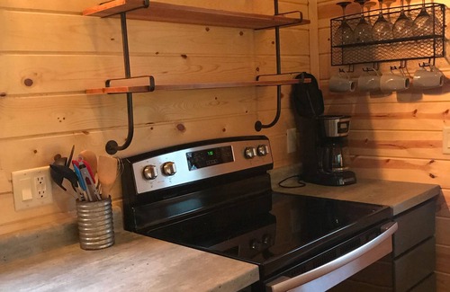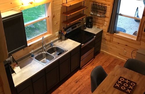 At the end of the day, the 16’x28’ cabin which boasts an 18-foot tall ceiling in the main room will welcome you and up to five additional guests (sleeps six). The two bedrooms, bathroom, full kitchen, electric heat, bathtub and shower, electric appliances, Satellite TV, WiFi, a storage shed for your use, and many other features will make your stay enjoyable and stress-free.