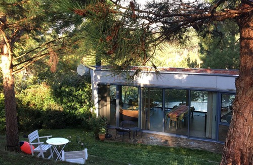 At the foot of the Belon river and on a point planted with pine trees, architect and glass and concrete house for 8 people spacious and modern of 200m2
