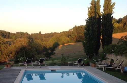 Set in grounds of approximately 3 acres, this architect designed and renovated stone house is situated on the edge of Saint Clar, a pretty market town with all amenities. In an elevated position affording stunning views across the surrounding unspoilt Gers countryside, the property offers peace and tranquility without being isolated. The house itself has a spacious, light and airy living room with open fireplace, and leads out on to the large south facing terrace. There is a newly fitted and fully equipped kitchen, utiity room and office area, as well as 3 double bedrooms each with either a balcony or terrace (2 with en suite shower rooms) and 1 twin room with en suite. Oil fired central heating. Wi-Fi and TV with UK terrestrial channels and DVD player.