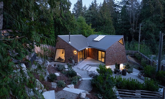 Architect designed rustic modernist retreat, Twin Peaks cabin is in the heart of Roberts Creek. Built into the bedrock and surrounded by trees, this two bedroom cabin, built in 2021, offers an elevated respite on the Sunshine Coast. Amazing kitchen and gas BBQ for the gourmand, and plenty of deck space, a fire pit, and a sauna. A perfect place to get busy in the kitchen, or do nothing at all. At night subtle lights illuminate the beautifully designed landscape.