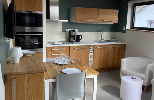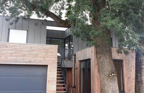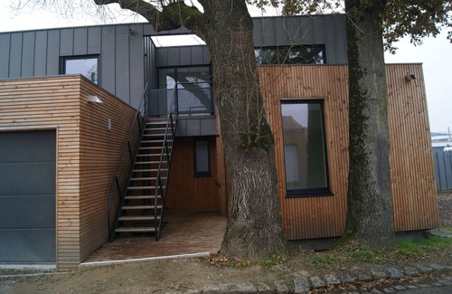 The new apartment (December 2013) of about 30 sqm is located upstairs in a quiet environment (Nantes south). Housing wood structure with flat green roof is organized around a patio terrace to provide, in combination with 2 skylights fitted in the roof, the maximum natural light. The views are framed on large branches of two trees nearby. It is even possible to admire the stars lying on the bed The interior spaces are functional and quality (floor heating to enjoy a gentle heat, resin floor). The comfortable equipment is complete.