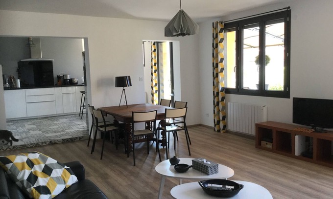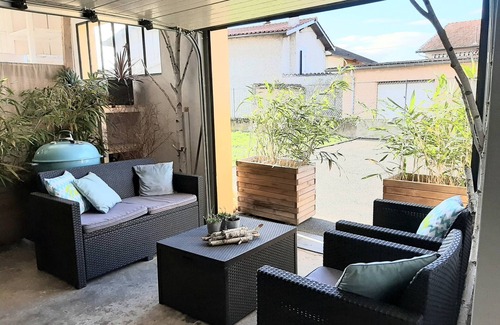 An architect's house in the heart of the village with its shops, restaurants and its castle. You will appreciate the calm of the neighborhood by taking advantage of the covered terrace or the outdoor sofa corner in the sun for a coffee. The T2 tram 150m from the house takes you to Lyon. The proximity to the motorway allows you to quickly reach the airport. You are also 5 minutes from the Saint Priest technology park and 7 minutes from the Eurexpo park. 50 m2 living room to enjoy with friends. Exclusive: We are equipped with wireless headsets translating 36 languages live to facilitate our exchanges with our foreign travelers in order to establish a more elaborate conversation than the simple instructions and greetings of use in English or French. You will have access to the whole house only the garage remains private for storage. You are in the heart of the village of Saint Priest to take advantage of the proximity of the shops, what a joy to go and get bread on foot in the morning in 3 min chrono go back. you are 200m from the T2 Alfred de Vigny tram stop which takes you directly to Lyon Thank you for taking care of the house as if you were staying with friends. We will ask you for a deposit of 70 € for cleaning on the day of entry which will be returned to you at check-out if you make it yourself or can be used for the service. We can also provide towels for € 10 / person. In order to respect our neighbors as our friends we do not accept travelers wishing to pass a wedding procession with us, thank you for your understanding. A few days before your stay with us, we will contact you to find out your arrival time. Together we will find the best time to welcome you and give you some tips on how to fully enjoy the house. We live right next to the coup an sms 15 min before your arrival allows us to adjust according to traffic. We will recommend good places to eat or places to visit in Lyon depending on what you are looking for. You can also arrive independently thanks to the key box and we will meet again later.