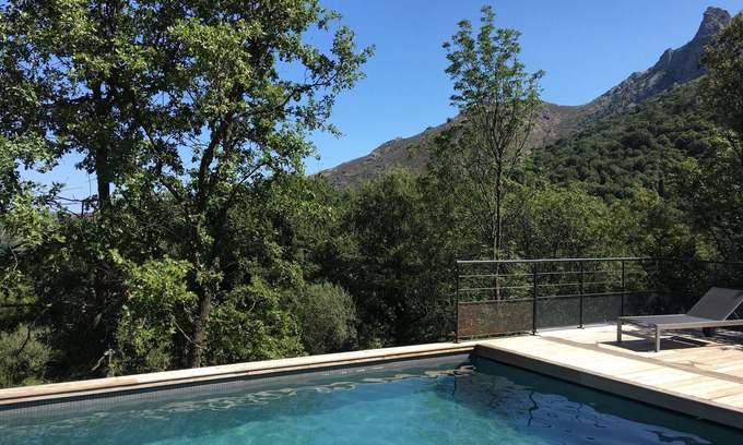Contemporary house on one level, located on the outskirts of the village. It enjoys an exceptional setting overlooking the mountains and panoramic views of the valley. Very large living space opening onto the terrace and heated pool. 4 bedrooms with private bathroom. Great calm. Comfort. Due to its large size and the disposition of the rooms it is ideal for groups of friends or families. Daily housekeeping is available upon request.
