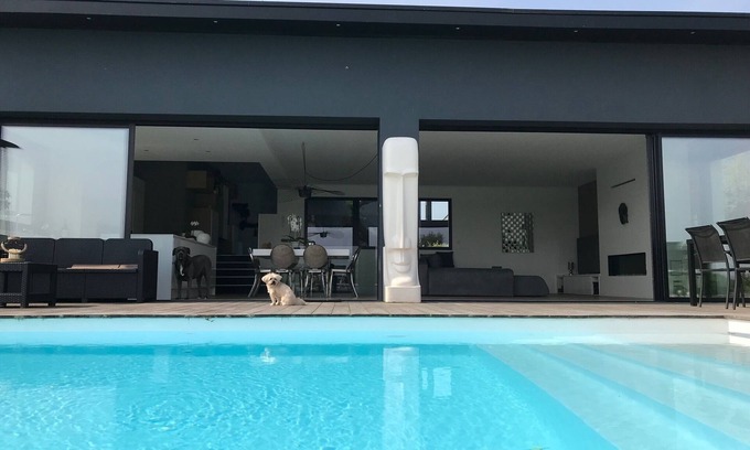 Sublime contemporary villa with open views of the nature reserve. Prox beaches and valves. 1st level entrance, master suite of 30 m2 including bathroom with monumental view, large living room of 67 m2, ground floor 1 bedroom overlooking private patio with jacuzzi. Sde. 140 extra bed in extra room with kitchenette. View as far as the eye can see from the heated infinity pool. + 100 m2 terrace. A true paradise ... Possibility of adding 2 additional rooms by renting the 2 studios for 100 euros per night extra.