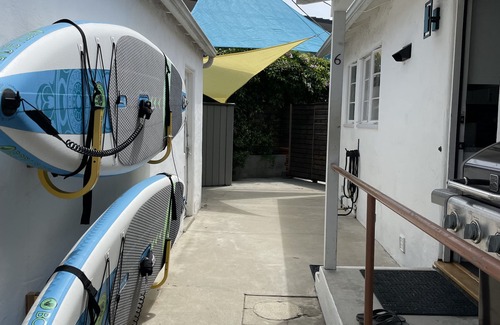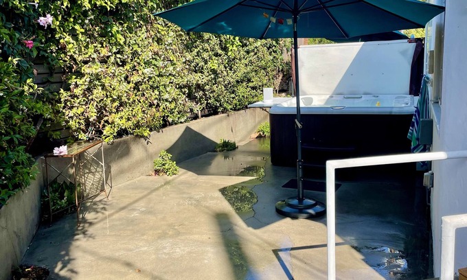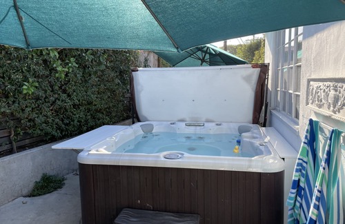You have the entire apartment to yourself, with one adjoining wall and private patio with six-person spa and fragrant jasmine and trumpet vines fencing, fire pit, outdoor sofa and umbrellas. Room to store bikes or beach equipment.