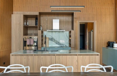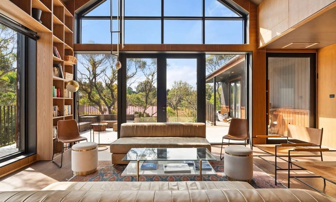 A stunning example of mountain architecture, this retreat features a glasshouse-inspired design that blurs the line between indoors and nature. Clad in recycled timber, the spacious open-plan layout and soaring ceilings create a serene, gallery-like atmosphere. Sunlight pours in through expansive windows, framing leafy views from every room and enhancing the sense of peace and connection to the surrounding landscape