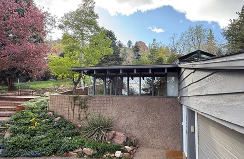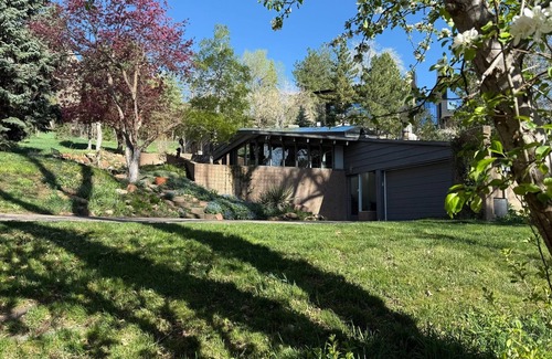 Architectural Retreat in the Heart of Boulder. Welcome to our 2,800 sq ft, 4-bedroom, 2-bathroom retreat, designed by renowned Boulder architect Charles Heartling, a protege of Frank Lloyd Wright. Nestled on a serene, tree-filled lot with a farmer's ditch and stunning views of Red Rocks Park and the Flatirons, this home blends nature and luxury. A skylight running the length of the house floods open living spaces with natural light, perfect for gathering, cooking, or relaxing.
