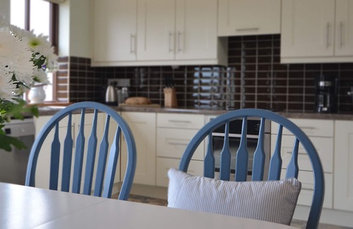 A bright open plan living area combining a contemporary white kitchen with stainless steel appliances, a dining area by the central stove with a large picture window looking out to sea and the classic, cosy lounge area that hugs the stove. The area is dominated by the natural stone central chimney which keep this sizeable area toasty. The kitchen has an electric hob and oven, dishwasher, large fridge/freezer, microwave, kettle and toaster.