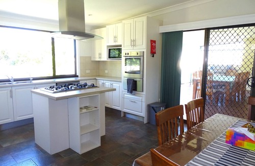 PROPERTY DETAILS: 3 bedrooms - queen, queen, trio bunk (double on the bottom, single on the top). Sleeps 7; Quilts and pillows provided – BYO sheets, pillowcases, towels, bathmats & tea-towels OR optional linen hire. Portacot (guests need to bring all bedding to use). Main bathroom with walk-in shower & vanity; Separate toilet; 2nd bathroom located off rear deck with walk-in shower & toilet. Split system air-conditioning in open plan living area; Ceiling fans in living area & outdoor entertaining area; Pedestal fan. Large television with USB & HDMI port in lounge room; Board games. 3rd bedroom (trio bunk) has television & DVD player; DVD’s. Fully equipped kitchen with gas stove, microwave, dishwasher & large fridge with freezer on top; Highchair. Top load washing machine. Undercover outdoor dining & seating on rear deck; Large television in undercover entertaining area; Hooded gas barbecue. Totem tennis; Cricket stumps. Secure yard with 6-foot fence; Lawned area at front & rear. Fish cleaning facilities. Undercover carport parking for 1 car; Off-street parking in driveway with room for up to 3 cars & a boat; No guest access to garage. 10 minutes’ walk into town & to jetty. Sorry, pets not permitted.