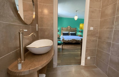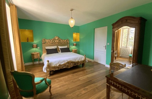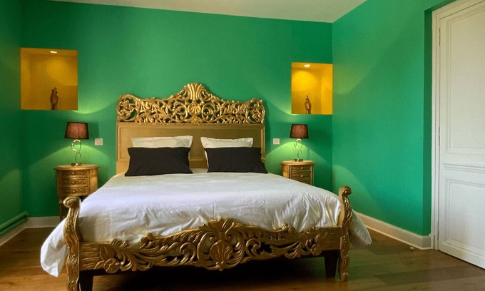 These green and gold colors invite you to a lord's vacation. Spacious and comfortable, its large majestic bed gilded with fine gold invites you to an unforgettable stay.