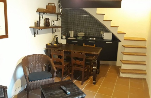 "Cal Tia" is the old house of the masoveros. It is distributed over two floors and has a practical kitchen / living room with fireplace and outdoor barbecue. Right next to it is a beautiful room with a vaulted ceiling. On this floor there is a sink for people with reduced mobility. On the first floor, it has a double bedroom with air conditioning and a triple bedroom, both share a bathroom.