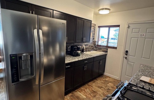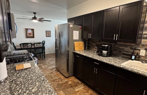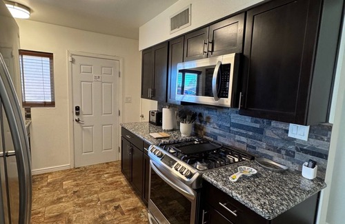 Have a wonderful stay in this beautifully furnished Arizona Apartment featuring seven 30ft+ Saguaros. All new appliances (2020), beds, washer/dryer, Microwave/Gas Range, and LG Refrigerator. Lovely "tiled" patio with fenced yard and BBQ included.