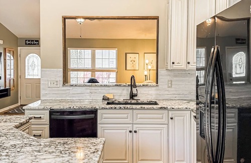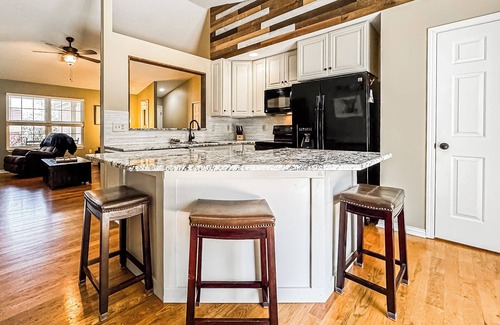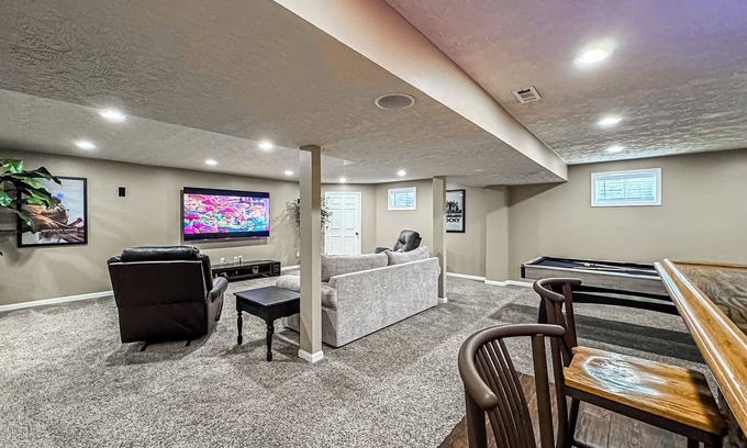 Enjoy this 4-bedroom, 3 full baths with 2 king and two queen beds. Listen to the waterfall while sitting on patio in private fenced in backyard with gas grill. Kitchen includes standard cooking supplies. Enjoy basement entertainment with pool table, bar and 85-inch TV.