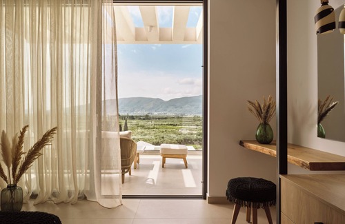 With enviable views to the pool & countryside, the villa radiates a chic elegance and a wonderfully laidback ambiance that enhances the comfort level of guests. Minimalistic design marks every corner of this holiday home gifting them with their unique identity, spoiling guests with premium bed comfort, design and amenities. This captivating home boasts exquisite interiors that exude a certain ethereal elegance, in its 150m² indoor space. Offering a bespoke design, the exclusive Residence boasts three bedrooms, a Living-cum lounge area with couch for two more guest to sleep & a fully equipped kitchen. An additional WC lays at the level of the living room. With direct access to the iconic pool from the living room area, the iconic villa can comfortably accommodate up to 6 guests in real beds and two more guests are welcome to sleep at the couch in the living room. The maximum capacity of this villa is 8 guests.