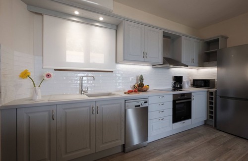 Armikes Beachfront Suite 2: This bright modern furnished suite covers a living space of 50 sq.m on the ground floor of a newly built building a few steps from the sandy beach of Agios Georgios. Armikes Suite can accommodate up to three guests, two in a large bedroom with king size bed and sea view plus one in the living area on a sofa bed. The luxury suite also features an open plan fully equipped kitchen with all amenities and a spacious shower with washing machine and cabinet enclosure. A large glazing door leads from the living area to the sunny veranda with an amazing view to Agios Georgios Bay. A large grassy garden extends in front of the building.